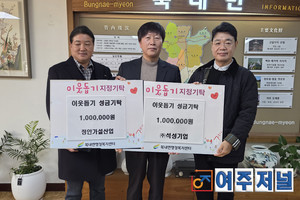 ㈜석성기업(대표 강남훈)과 ㈜정안가설산업(대표 우세윤)은 지난 3일 어려운 이웃을 위해 각각 100만 원을 북내면행정복지센터(면장 이준기)에 기탁했다.이번 성금은 연말연시를 맞아 지역사회 내 어려운 이웃들이 따뜻하고 안정적인 겨울을 보낼 수 있도록 지원하기 위해 마련됐다.기탁된 성금은 경기사회복지공동모금회를 통해 지정 기탁 후 취약계층의 생계 및 복지 향상을 위한 사업에 사용될 예정다.