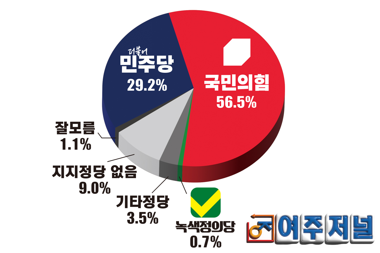 여주저널과 여주저널편집·운영위원회가 선거여론조사기관인 ㈜유앤미리서치에 의뢰해 지난 2월 3일부터 2월 4일까지 여주시와 양평군에 거주하는 만 18세 이상 남녀 1000명을 대상으로 정당 지지도를 조사한 결과 응답자의 56.5%는 국민의힘을, 29.2%는 더불어민주당을 지지한다고 답했다.