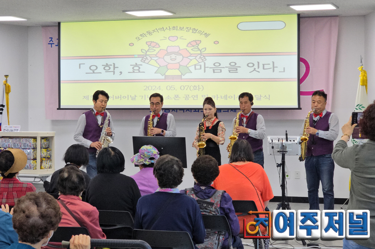 이번 행사는 제52회 어버이날을 맞아 오학동 새마을부녀회에서 떡을 기부하고 오학동 색소폰 봉사단(단장 김선은)은 지역 어르신들을 위해 연주 공연을 했다.