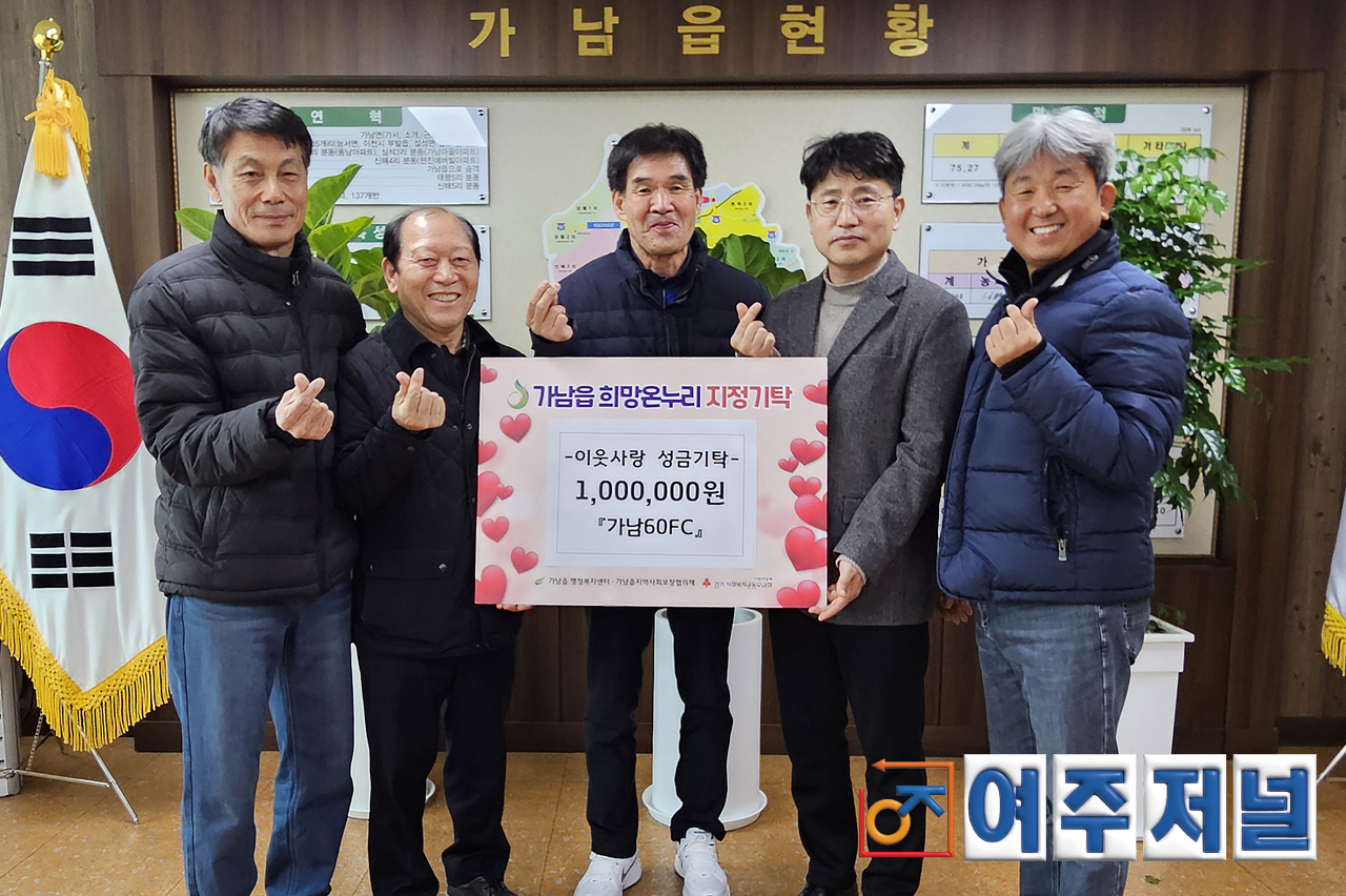 가남60FC(회장 황현석)는 지난 4일 어려운 이웃을 위해 써달라며 성금 100만 원을 가남읍행정복지센터(읍장 임영석)에 전달했다.