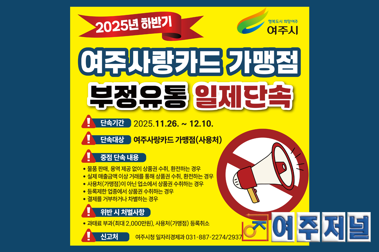 여주시는 오는 12월 10일까지 지역화폐인 여주사랑카드의 부정유통에 대해 집중 단속에 나선다.